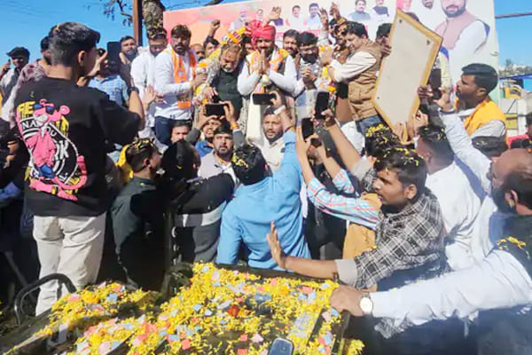 स्वागत के दौरान युवा मोर्चा नेता बिट्टू विवेक मंडराह द्वारा 15 जेसीबी मशीनों से पुष्पवर्षा कराई गई।